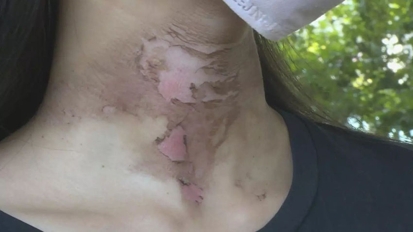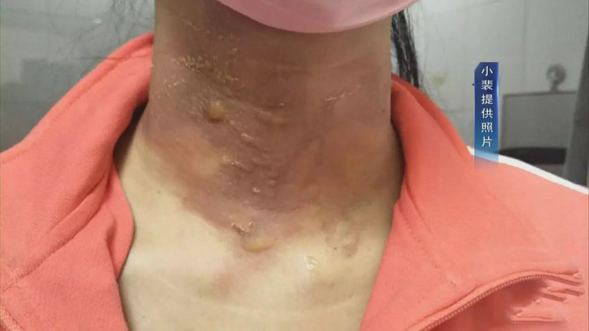 ![]() 圖為回家后起水泡圖 從小裴提供的照片可以看到,當(dāng)初傷后,小裴脖子上的皮膚發(fā)紅發(fā)黑,密密麻麻出現(xiàn)了很多水泡。 小裴:和平醫(yī)院醫(yī)生看了看說可能后期會留痕或者是脖子變色,這是他們陪同我總共是去了兩次醫(yī)院,后來給他們發(fā)微信他們也沒回,找他們boss,但一直說出差,也沒有給回應(yīng)。 隨后的幾天里,小裴感覺越來越疼,甚至讓她難以忍受。 后來,水泡破裂,皮膚出現(xiàn)了破損,甚至有的部位開始發(fā)黑,這種情況讓小裴十分擔(dān)心。 |