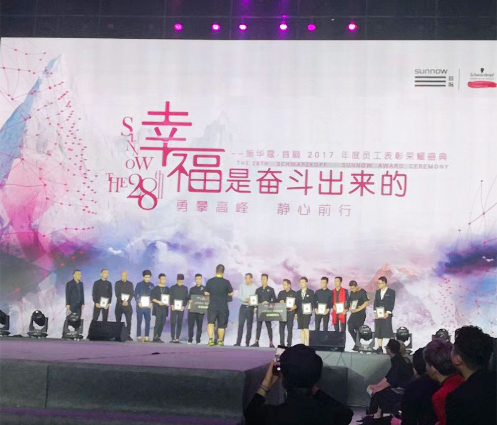 ![]() 盛會臨近尾聲,主持今年活動的18位支持人登場,宣布“幸福是奮斗出來的”—首腦2017年度員工表彰盛 典大會完滿結束! |