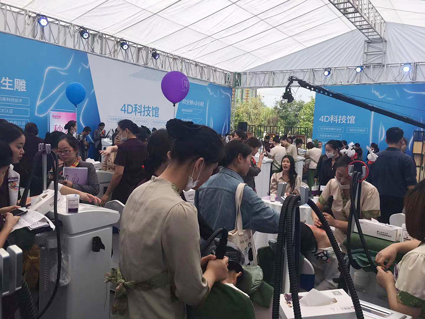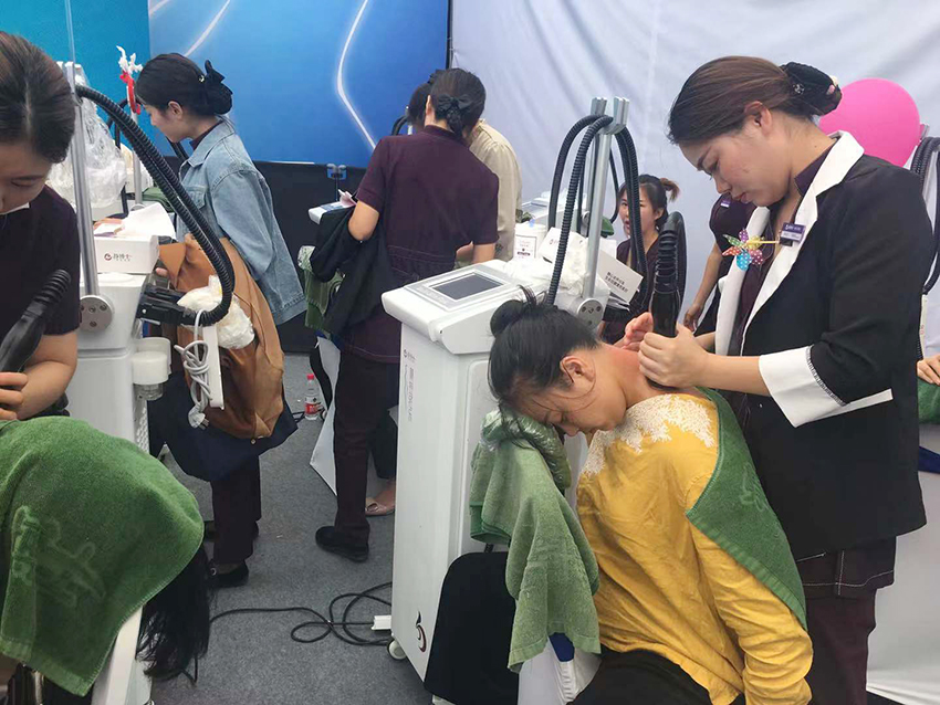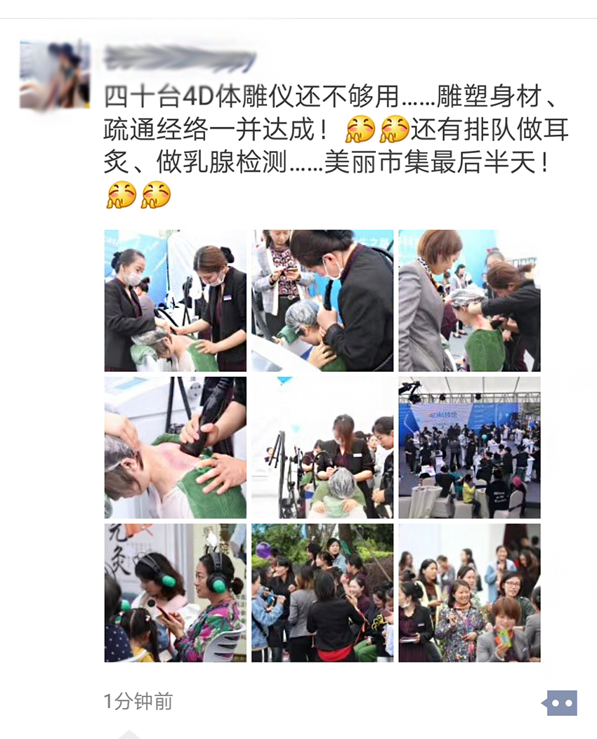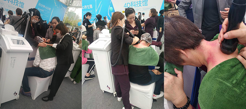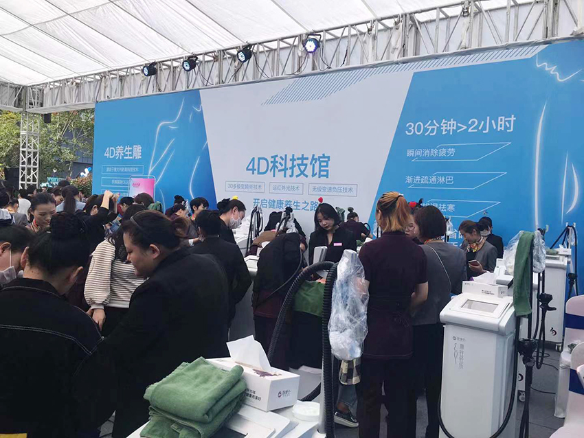 在這場美麗市集中,4D科技館自19號開放以來一直人氣爆棚!靜博士將率先開啟養生2.0時代,30分鐘超越手工2小時,前來體驗的人紛紛拍手稱奇,明顯感受到肩頸酸脹得到了減緩,靜博士相關人員都發表說40臺4D體雕儀還不夠用......