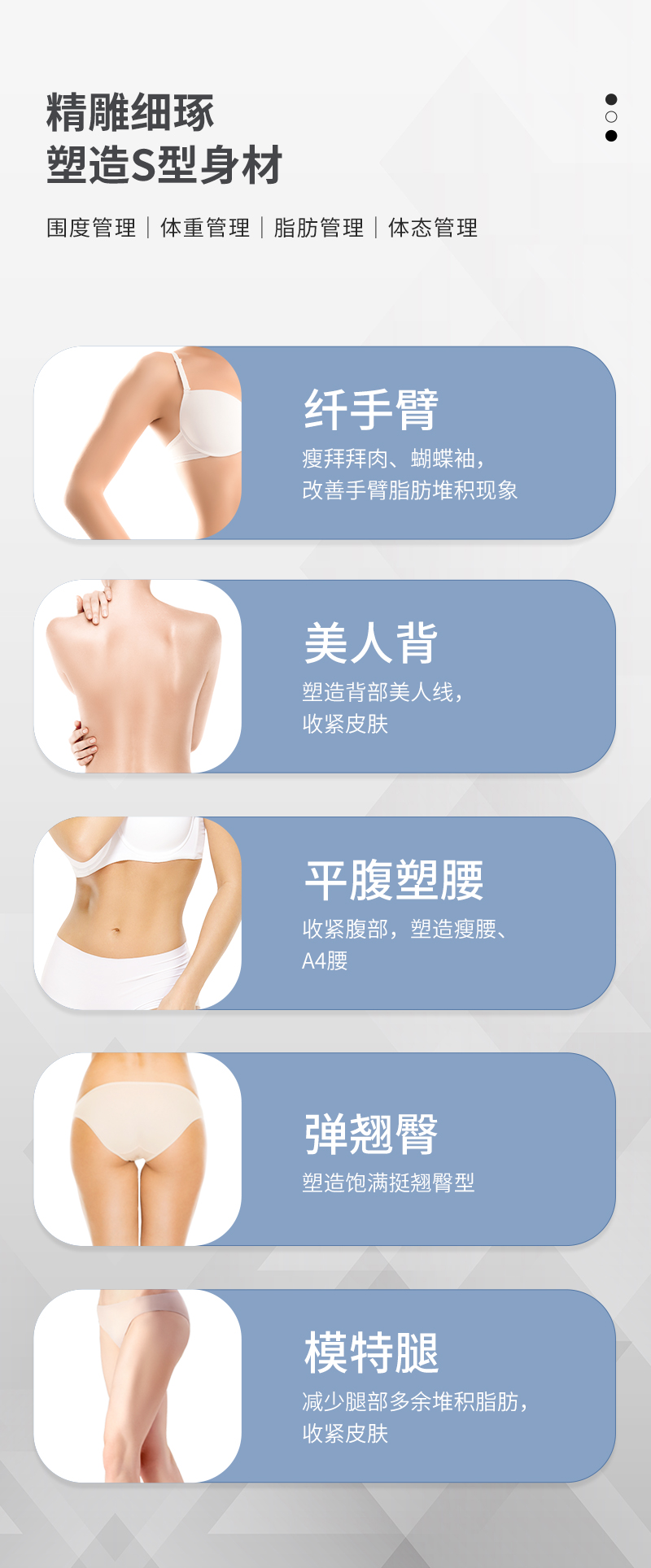 | 優(yōu)勢 | 利用三大技術雕塑體型,減少脂肪細胞的數(shù)量,減小脂肪細胞體積的大小,讓塑形的效果更快、維持得更久。 | ||