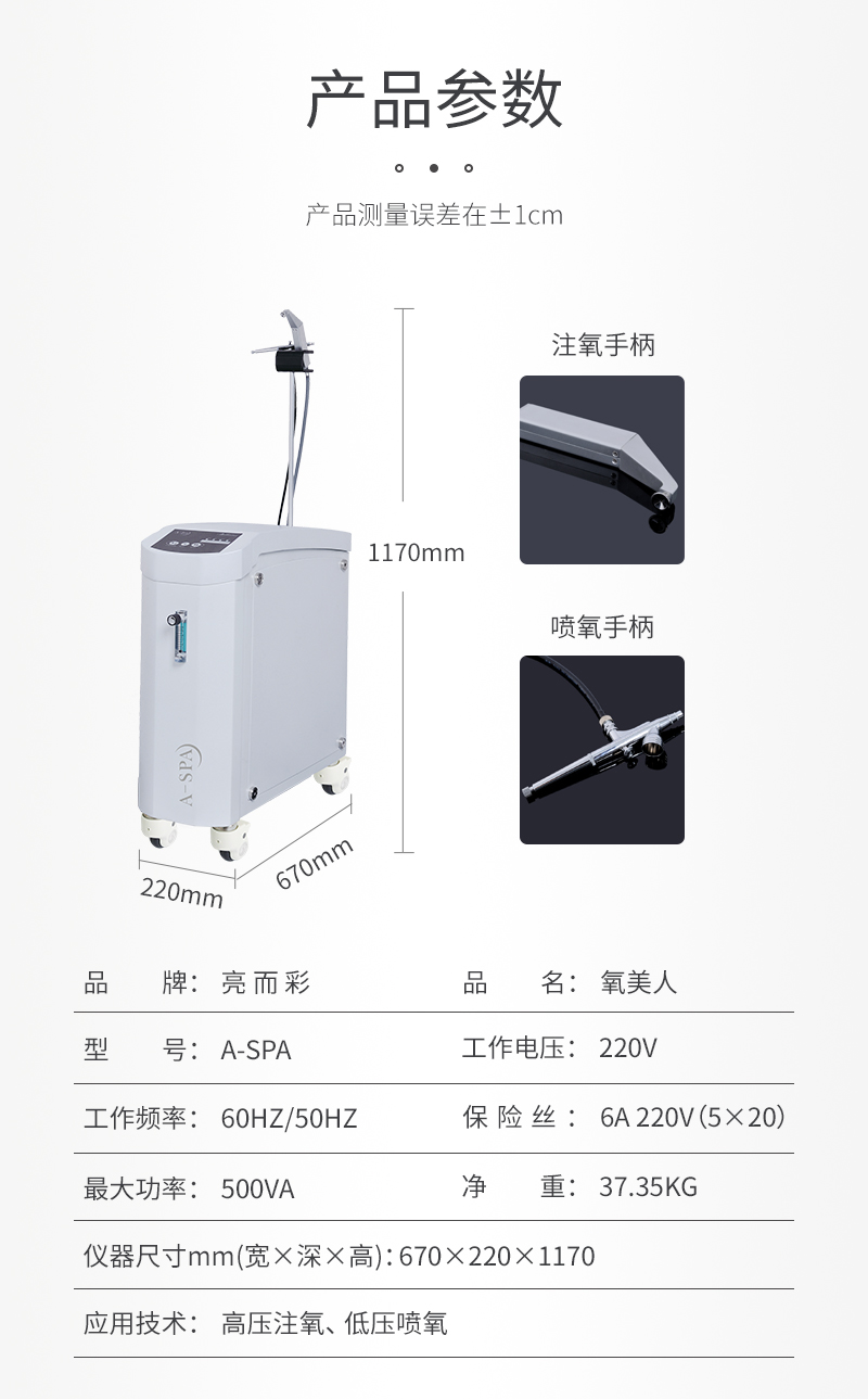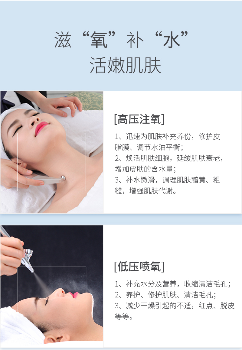 | 功效 | 高壓注氧 迅速為肌膚補充養份,修護皮脂膜、調節水油平衡; 煥活肌膚細胞,延緩肌膚衰老,增加皮膚的含水量; 補水嫩滑,改善肌膚黯黃、粗糙,增強肌膚代謝。 |