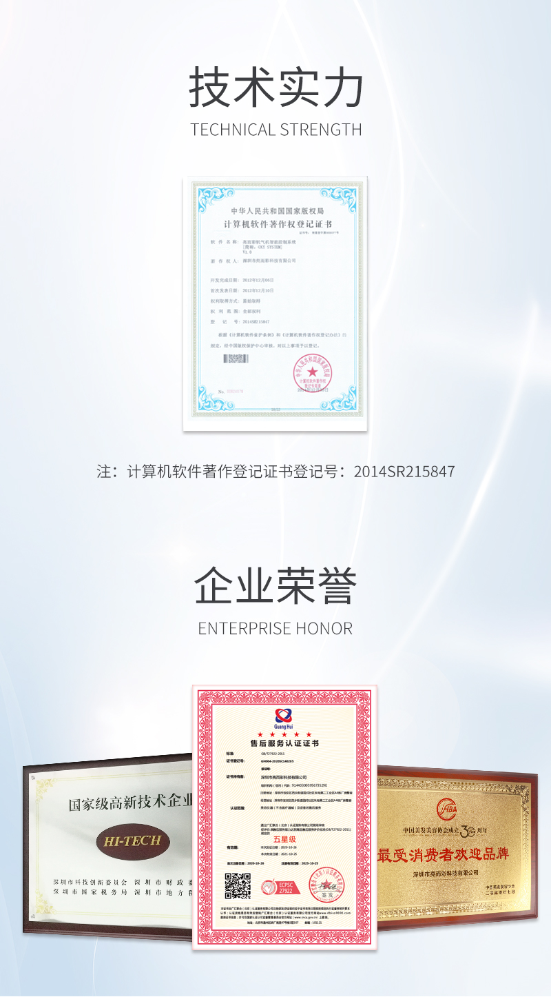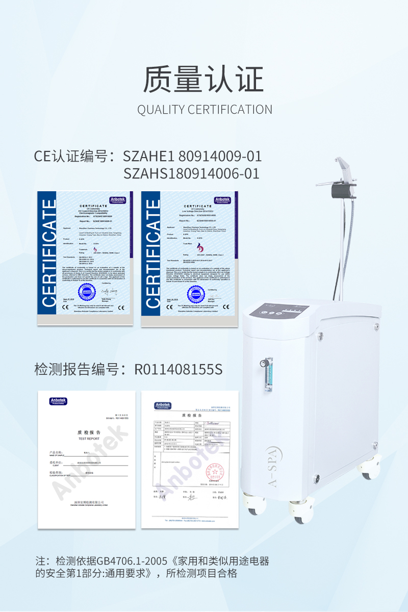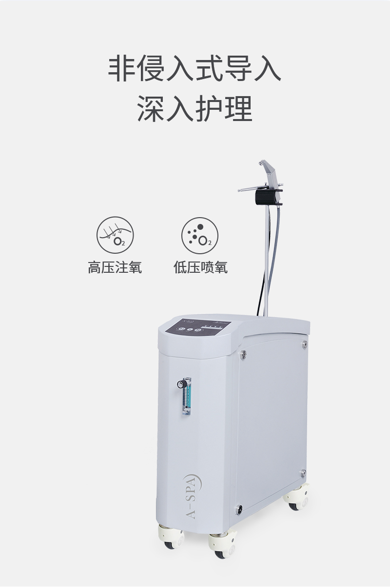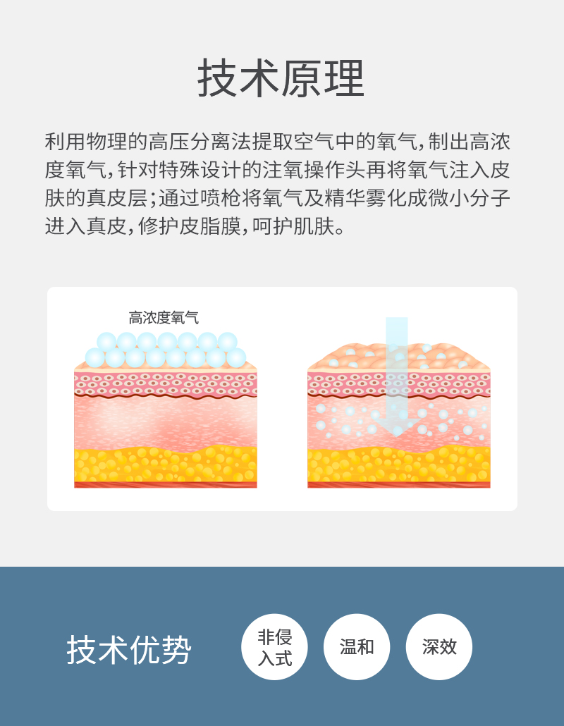 | 優勢 | 利用物理的高壓分離法提取空氣中的氧氣,制出高濃度氧氣,針對特殊設計的注氧操作頭將氧氣注入皮膚的真皮層; 通過噴槍將純氧及精華霧化成小分子進入真皮,修護皮膚皮脂膜 | ||