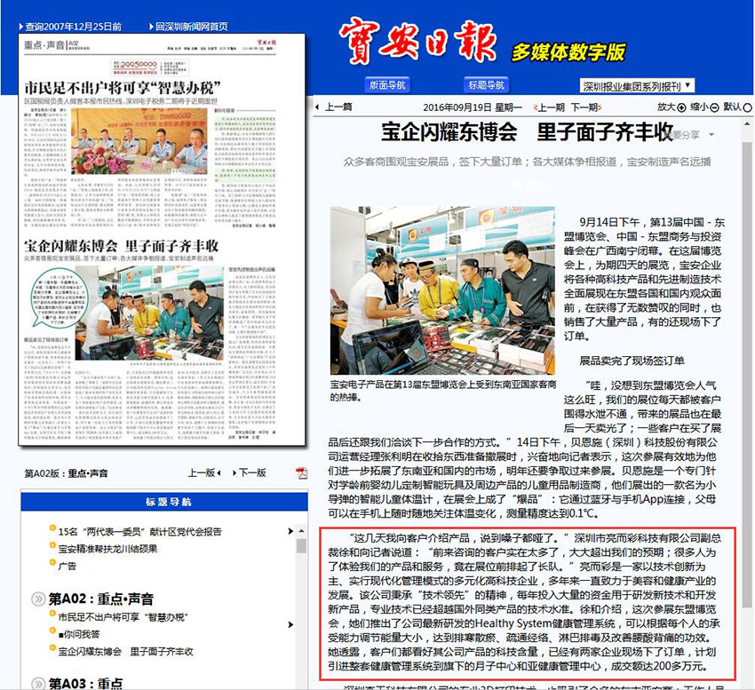 亮而彩代表政府參加第十三屆中國(guó)東盟博覽會(huì)的美容儀器廠家,產(chǎn)品盡顯優(yōu)勢(shì)!開展的第一天,深圳市高裕躍秘書長(zhǎng)就帶領(lǐng)市領(lǐng)導(dǎo)團(tuán)前來展位參觀,并對(duì)本公司儀器給予肯定的贊揚(yáng),感謝市領(lǐng)導(dǎo)對(duì)亮而彩集團(tuán)的健康管家項(xiàng)目的高度認(rèn)可。我們相信,在各位領(lǐng)導(dǎo)的大力支持下,亮而彩集團(tuán)將會(huì)更上一層樓! 9月14日,第13屆中國(guó)-東盟博覽會(huì)、中國(guó)-東盟商務(wù)與投資峰會(huì)在廣西南寧完滿閉幕 深圳亮而彩榮獲政府的邀請(qǐng),成為代表政府參加第十三屆中國(guó)東盟博覽會(huì)的美容儀器廠家。本次博覽會(huì),亮而彩優(yōu)先推出新研發(fā)的健康管理系統(tǒng),吸引了廣大客戶,并獲得政府領(lǐng)導(dǎo)對(duì)本公司儀器的贊揚(yáng)和肯定。《寶安日?qǐng)?bào)》對(duì)亮而彩進(jìn)行了提點(diǎn)報(bào)道。