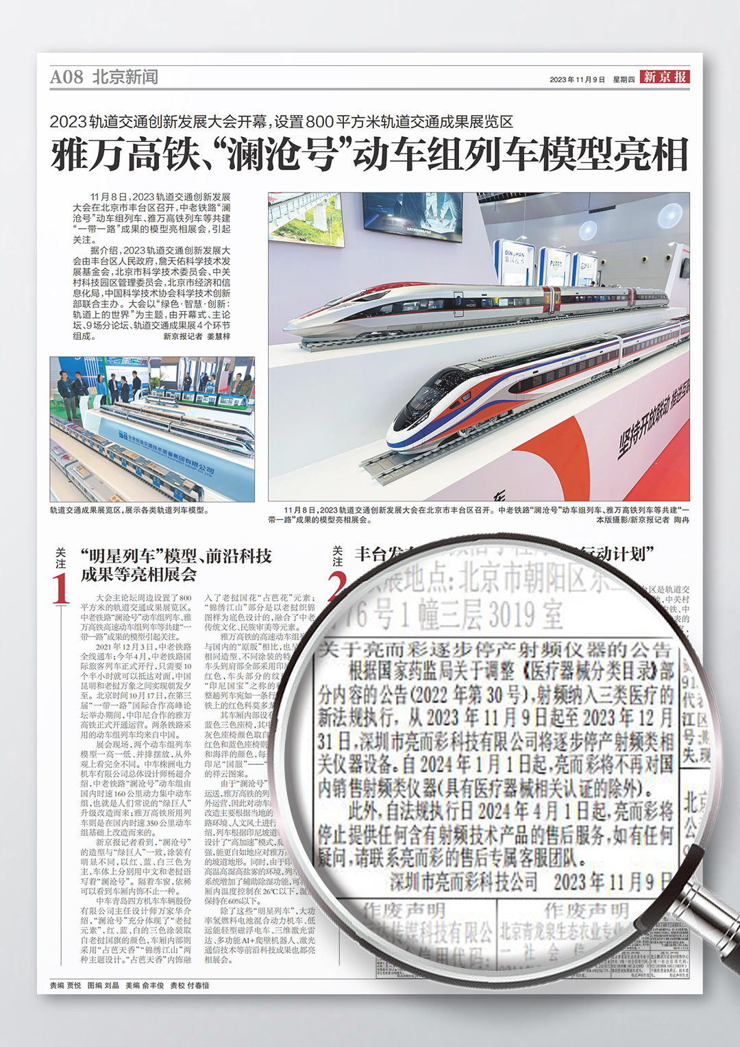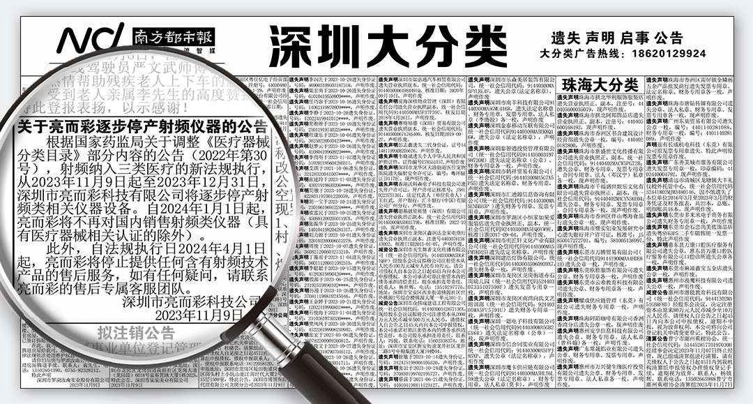 11月9日,關于“亮而彩逐步停產射頻儀器”的公告信息,正式刊登于新京報(A08版右下方)及南方都市報(深圳版面左上方)。