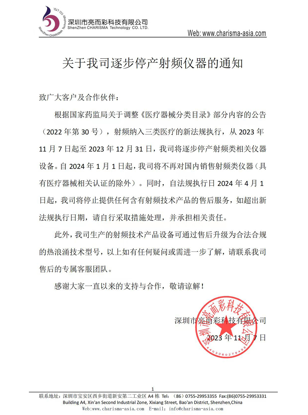 聲明顯示,從2023年11月7日起至2023年12月31日,深圳市亮而彩科技有限公司將逐步停產射頻類相關儀器設備。自2024年1月1日起,亮而彩將不再對國內銷售射頻類儀器(具有醫療器械相關認證的除外)。