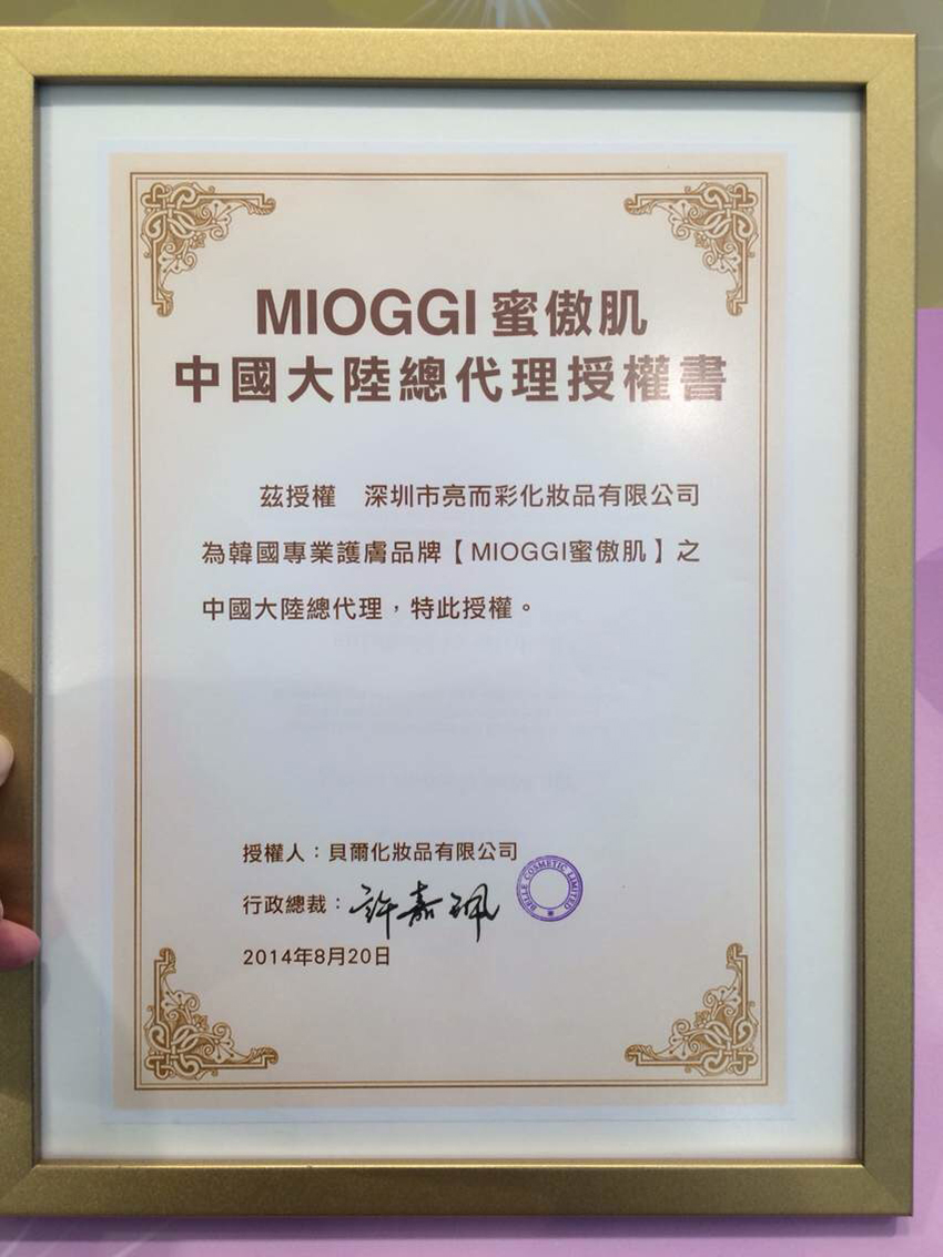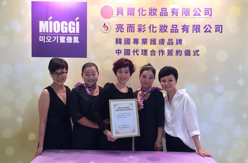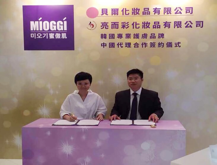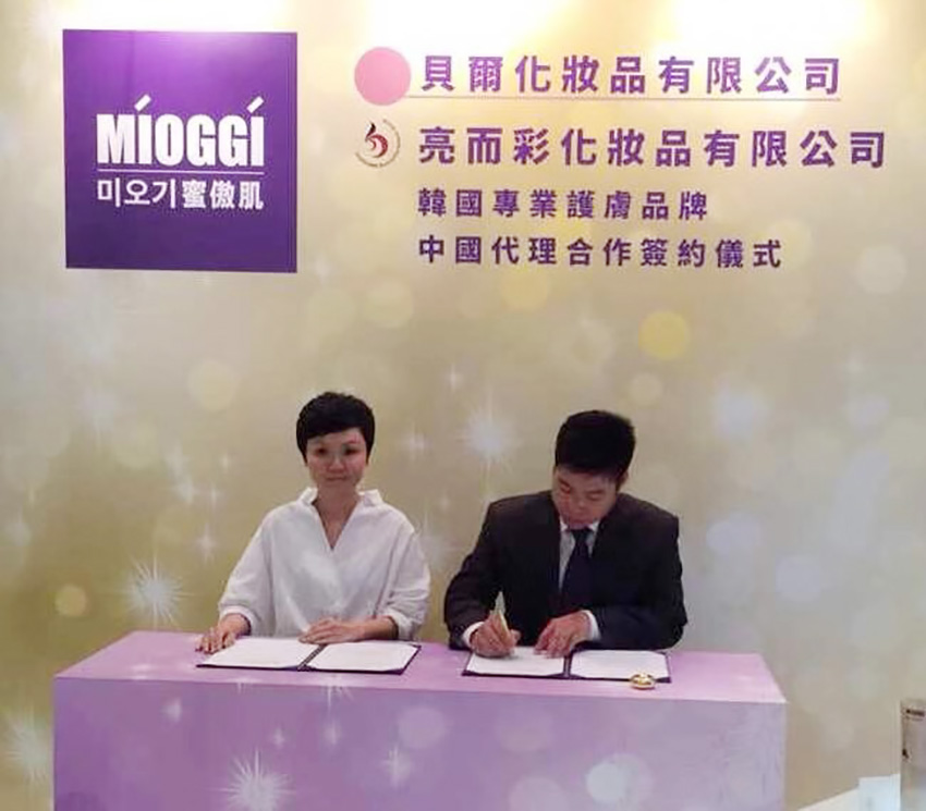 在八月二十號這天,亮而彩與香港貝爾簽訂戰略合作伙伴協議,亮而彩成為韓國進口的Mioggi(蜜傲肌)系列產品的中國大陸區域代理。![]() |