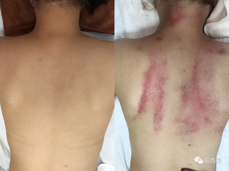 ![]() 左邊未做手法、儀器,右邊做了手法、妙纖大師 接下來是學習養身美容儀器養生專家的操作技巧,養生專家一般使用再肩頸和背上,下面我們看看做背的效果吧。 首先在背上涂了平衡霜,相對于外面美容師給涂的厚厚的油來說,這個霜簡要更清爽,接下來就是先用專一手法疏理清毒,接著用養生專家,操作頭在背上肩胛骨這一塊進行操作。 |